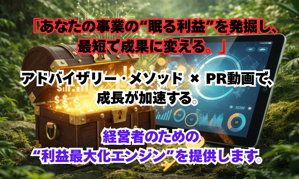 「アドバイザリー・メソッド × PR動画」で、戦略・伝え方・実行まで一気通貫で支援する経営者のための成長支援。あなたの事業の本当の価値を市場に響かせます!